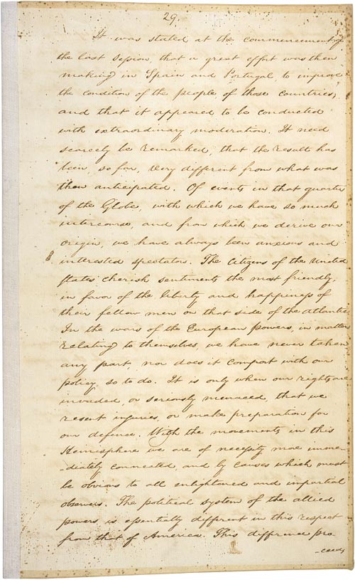 “Невозможно, чтобы союзные державы распространили свою политическую систему на какую-либо часть любого из континентов, не поставив под угрозу наш мир и счастье; никто не может поверить, что наши южные братья, предоставленные сами себе, приняли бы её по собственной воле. Поэтому также невозможно, чтобы мы безразлично относились к подобному вмешательству в любой форме. Если мы посмотрим на сравнительную силу и ресурсы Испании и этих новых правительств, а также на их расстояние друг от друга, должно быть очевидно, что она никогда не сможет их покорить. Истинная политика Соединенных Штатов по-прежнему заключается в том, чтобы предоставить стороны самим себе, в надежде, что другие державы будут следовать тому же курсу…”