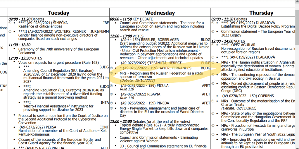 Cтрасбург 20.11.2022 ПРЕДЛОЖЕНИЕ О РЕЗОЛЮЦИИ о признании Российской Федерации государством-спонсором терроризма: нижеследующие депутаты выдвигают на голосование в настоящей ноябрьской сессии Европарламента Резолюцию: